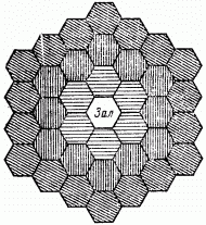 Рис. 106. Троекратное отражение стен центрального зала дает 36 зал.