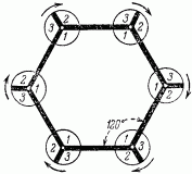 Перемена обстановки в этом «Дворце миражей» достигалась следующим образом: зеркальные стены на некотором расстоянии от ребер разрезаны вдоль, и полученный угол может вращаться вокруг оси, заменяясь другим. Из рис. 107 видно, что можно произвести три замены, соответствующие углам 1, 2 и 3. Теперь представьте себе, что все углы, обозначенные цифрой 1, заключают в себе обстановку тропического леса, все углы 2 — обстановку арабского зала, а углы 3 — индийского храма.