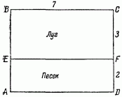 На рис. 110 указано, что ширина песчаной полосы 2 км, луговой — 3 км, а расстояние ВС — 7 км. Тогда вся длина AC (рис. 111) равна, по теореме Пифагора, корень(52 + 72) = корень(74) = 8,60 км. Часть AN — путь по песку — этого отрезка составляет, как легко сообразить, 2/5 этой величины, т. е. 3,44 км. Так как по песку движение происходит вдвое медленнее, чем по лугу, то 3,44 км песчаного пути равнозначны, в смысле требуемого времени, 6,88 км по лугу. И, следовательно, весь смешанный путь по прямой АС, равный 8,60 км, соответствует 12,04 км пути по лугу.