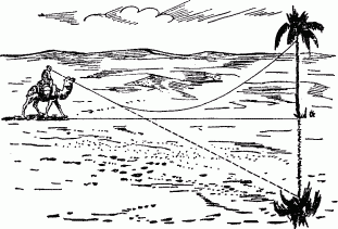 Рис. 115. Как возникает мираж в пустыне. Этот рисунок, обычно воспроизводимый в учебниках, представляет путь светового луча наклоненным к земле преувеличенно круто.