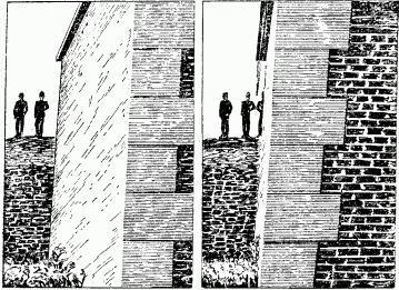 На рис. 118 изображена (слева) стена F форта, сначала матовая, а затем блестящая (справа), как зеркало (снята из точки A'). На левом снимке — обыкновенный серый бетон, в котором, конечно, не могут отражаться стоящие близ стены фигуры двух солдат. Направо — та же стена в большей своей части приобрела зеркальные свойства, и ближайшая фигура солдата дает в ней свое симметричное изображение. Конечно, отражает лучи тут не сама поверхность стены, а лишь прилегающий к ней слой нагретого воздуха.