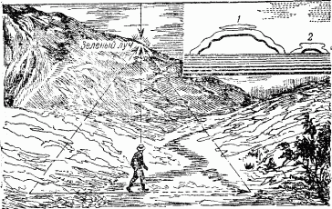 Рис. 119. Длительное наблюдение «зеленого луча»; наблюдатель видел «зеленый луч» за горным хребтом в течение 5 минут. Выше справа — «зеленый луч», видимый в подзорную трубу. Диск Солнца имеет неправильные контуры. В положении 1 блеск солнечного диска ослепляет глаз и мешает видеть зеленую каемку простым глазом. В положении 2, когда диск Солнца почти исчезает, «зеленый луч» становится доступным простому глазу.