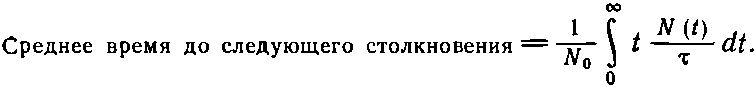 Первоначально мы определили ? как среднее время между столкновениями. Сформулированный в виде уравнения (43.7) результат говорит нам, что среднее время, отсчитываемое от произвольно взятого момента до следующего столкновения, также равно ?. Этот несколько удивительный факт можно продемонстрировать следующим образом. Число молекул, которые испытают их следующее столкновение в промежутке dt, отсчитанного от времени t после произвольно взятого начального времени, равно N(t)dt/?. Их «промежуток времени до следующего столкновения» равен, конечно, t. «Среднее время до следующего столкновения» получается обычным образом: