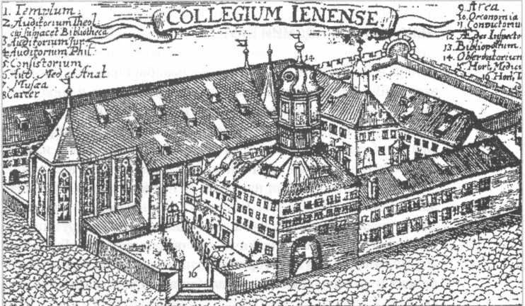 Гравюра, изображающая Йенский университет около 1600 года. Там в 1663 году Лейбниц провел один семестр и познакомился с Эрхардом Вейгелем.