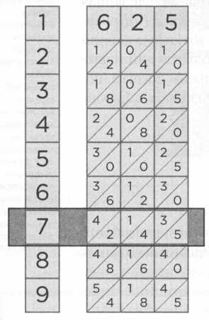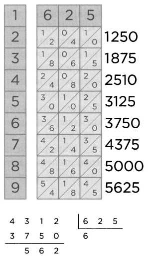 Произведение сводится к тому, чтобы провести серию сложений, поскольку произведения для каждой цифры уже имеются в таблице. Чтобы провести деление, требуется обратный процесс, вычитание. Если мы хотим разделить 4312 на 625, нужно взять таблички, соответствующие делителю (625), и выполнить все операции умножения в каждой линии с целью найти наиболее близкое к делимому (4312) число, меньшее его. Таким образом мы получаем частное (6), как видно из рисунка 9. Наконец, чтобы найти остаток от деления, мы должны вычесть из 4312 значение 3750, что дает нам в результате 562.