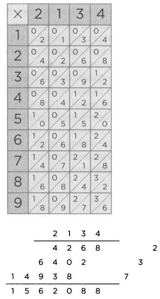 С помощью данного изобретения можно было умножать большие числа. Следовало взять соответствующие колонки, чтобы цифры в верхних квадратах образовали искомое число. После этого нужно просто сложить между собой значения из соответствующей строки с учетом их разрядности. Так, для умножения числа 625 на 7 в соответствующем ряду умножения получались значения 4 для тысяч, 3 = 2 + 1 для сотен, 7 = 4 + 3 для десятков и 5 для единиц. То есть 625 х 7 = 4375. Мы можем убедиться в этом, взглянув на рисунок 7. Если нужно умножить большие числа, достаточно выбрать каждый ряд цифр второго множителя и последовательно сложить числа, полученные предыдущим способом. Чтобы умножить 2134 на 732, необходимо распределить таблицы так, как показано на рисунке 8. Суммируются значения, соответствующие каждому множителю. Следует учитывать, что когда мы складываем по диагонали, а сумма больше девяти, как в случае с десятками произведения 2134x3, мы помещаем на их место единицы, а десятки этого результата прибавляются к следующей цифре.
