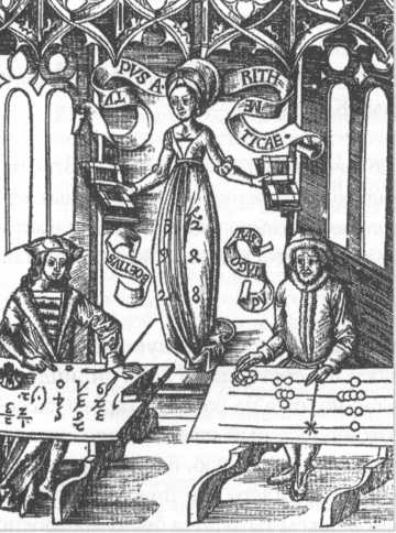 Гравюра, сделанная Грегором Рейшем для своей книги «Жемчужина философииш (1508). На ней показано соревнование между абакистом (Пифагором) и алгористом (Боэцием).