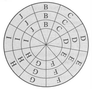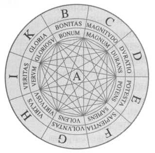 ВС CD DE EF FG GH HI U BD СЕ DF EG FH GI HJ BE CF DG ЕН FI GJ BF CG DH EI FJ BG СН DI EJ ВН CI DJ BI CJ BJВ качестве дополнения Луллий создал ряд из четырех аксиоматических фигур, смешав одни начала с другими. Ему нужно было механически осуществить то, что ему не позволяли сделать скудные математические познания. Одна из таких фигур соответствовала предыдущей таблице, другая — это круг (как на рисунке 1), поделенный на девять секторов, в которых находились абсолютные начала. На этом круге все достоинства равноудалены от центра, где находится Бог. Под каждой буквой располагается существительное и прилагательное, и каждый сектор связан с другими восьмью, указывая все возможные сочетания. Их можно перемешивать, при этом существительные превращаются в прилагательные и получается, например, великая доброта или доброе величие.