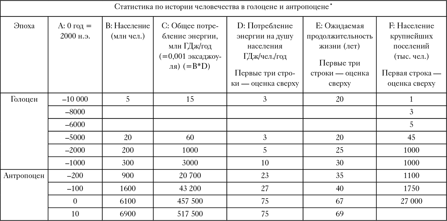 Числа в столбцах с A по E основаны на данных из: Vaclav Smil. Harvesting the Biosphere, loc. 4528, Kindle; в столбце F: Ian Morri. Why the West Rules – for Now. P. 148–149 и интерполяции данных для времени за 10 000 лет до сегодняшнего дня. – Прим. автора.