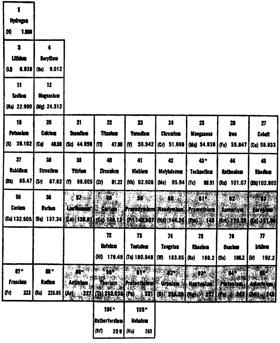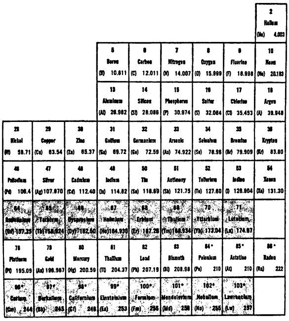 Таблица 3 и есть общепринятая современная периодическая система. Элементы расположены в порядке возрастания атомного веса (есть, правда, три исключения, которые я поясню чуть ниже), и каждый элемент имеет свой порядковый номер — от 1 до 103. Значение этого «атомного номера» мы обсудим чуть ниже.