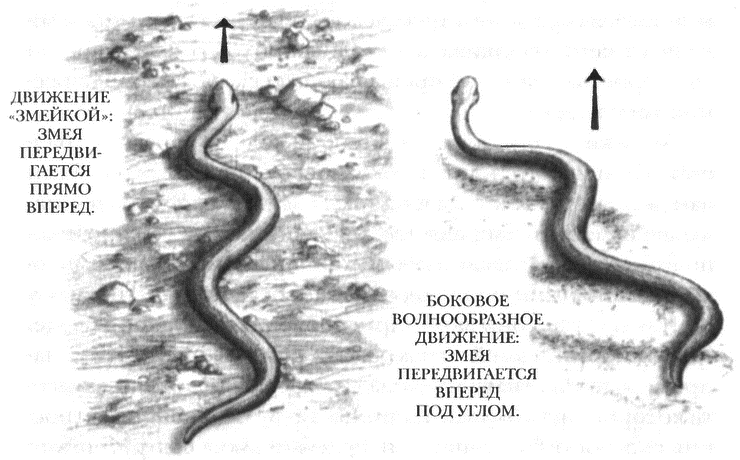 В том месте, где мышцы сокращаются, бугрясь, чешуйки змеиного брюха начинают слега топорщиться. И этими сотнями «коготков» змея цепляется за почву — совсем как дождевой червь щетинками. Волна мышечных сокращений и расслаблений проходит по всей длине брюха — змея медленно двигается вперед, отталкиваясь от почвы чешуйками, которые сцепились с землей.