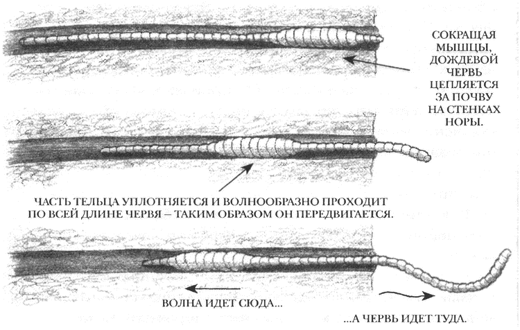 Потому как эти маленькие пахари, без которых ни одному саду не цвести, передвигаются в почве, сокращая и расслабляя мышцы от начала к концу тельца. В том месте, где возникает мышечное напряжение, тельце червя сжимается и уплотняется, цепляясь за почву крошечными щетинками. Уплотнившаяся часть червя волнообразно продвигается по тельцу — и червь движется вперед. Движения сегментов тела червя, прорывающего в земле ход, характеризуются волнообразными колебаниями не из стороны в сторону — «змейкой», а вперед-назад, параллельно направлению движения червя.