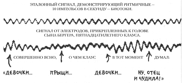 Наблюдая за ритмами мозговых волн сына, Бергер обнаружил, что нейроны, пусть даже их и тысячи, пульсируют вовсе не беспорядочно, а в определенной последовательности. Пока сидевший во время эксперимента Клаус находился в спокойном, но собранном состоянии, показатели напряжения варьировались, однако сам ритм оставался постоянным — около 10 «циклов» (от отрицательного заряда к положительному) в секунду.{22}
