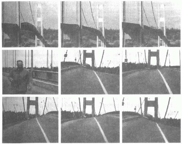 Профессор установил кинокамеру возле мостовой опоры, где колебания были минимальными, и снимал машину Коутсворта на центральном пролете — она раскачивалась, резко кренясь.[14] Коутсворт рассказал профессору о несчастном псе на заднем сидении. Профессор наверняка был из собачников — он решил, что животное нужно немедленно спасти.