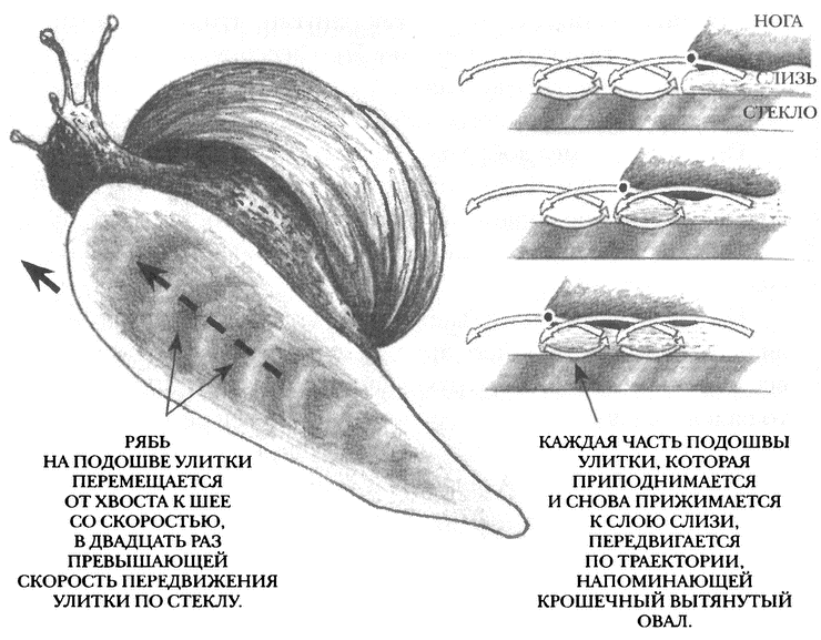 Улитка, этот бич огорода, подбираясь под покровом ночи к великолепному кочану капусты, хитроумно сочетает при движении волны поперечные и продольные. Чтобы понять, как это происходит, понаблюдайте за блестящей от слизи подошвой ее ноги. Впрочем, волнообразные сокращения мышц ничтожно малы — так просто вы их не заметите. Если толь ко не посадите улитку на оконное стекло. Встав с противоположной стороны, вы увидите едва заметную мышечную рябь, пробегающую по всей длине ноги — небольшие участки подошвы будут становиться то светлее, то темнее. Темные полосы образуются там, где улитка чуть отрывает ногу от склизкой тропы, светлые — где она ее прижимает. Удивительно то, что у обычной садовой улитки или слизня мышечная волна идет от хвоста к голове. Улитка слегка приподнимает хвост, сжимает и ставит его кончик чуть ближе к ноге — образуется крошечный изгиб подошвы. Постепенно он перемещается вперед, пока не достигает головы — голова приподнимается и опускается чуть дальше вперед.