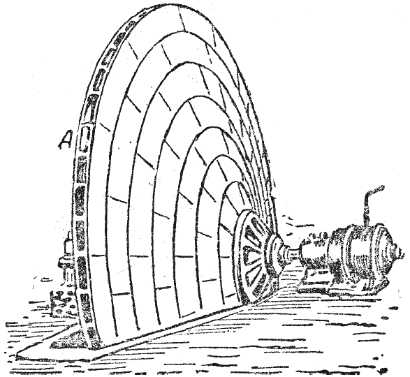 Рис. 51. Проект отсылки межпланетного вагона (А) вращением огромного колеса