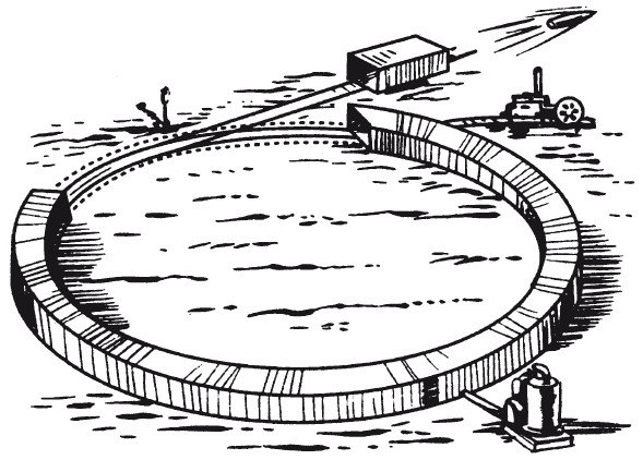 Второй проект – принадлежащий, по-видимому, Графиньи – кажется на первый взгляд более осуществимым. Здесь также используется инерция кругового движения, но большое колесо заменено неподвижным кольцевым рельсовым путем, проложенным внутри кольцевого туннеля; поперечник кругового пути – 20 км. По рельсам (рис. 52) скользит (под действием электрического тока) на обильно смазанных полозьях тележка, несущая на себе межпланетный снаряд-вагон. Движение тележки обусловлено особым двигателем, помещающимся вне ее и передающим ей свою энергию по проводу между рельсами. Так как двигатель работает непрерывно, то тележка должна скользить ускоренно. Для уменьшения сопротивления среды воздух внутри туннеля разрежается насосами. От кругового туннеля отходит по направлению касательной ответвление с наклоном вверх. Когда тележка со снарядом, сделав достаточное число оборотов по круговому пути, разгонится до скорости 12,5 км/с, она автоматически переводится на ответвление, на котором и подвергается торможению. Движение тележки замедляется, но лежащий на ней снаряд соскальзывает по инерции с тележки и летит в атмосферу со скоростью 12,5 км/с, которая по выходе из воздушной оболочки в мировое пространство понижается до 10,9 км/с. Управление снарядом в его свободном полете предполагается осуществлять с помощью реактивного двигателя.