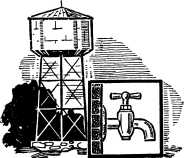 Вода в водопровод подается из водоема или огромного бака, устроенного на высоком холме.
