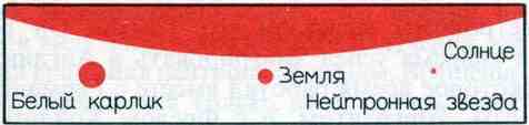 Рис. 8.9. Солнце, белый карлик, Земля и нейтронная звезда в сравнении между собой. От Солнца на рисунке поместился только край.