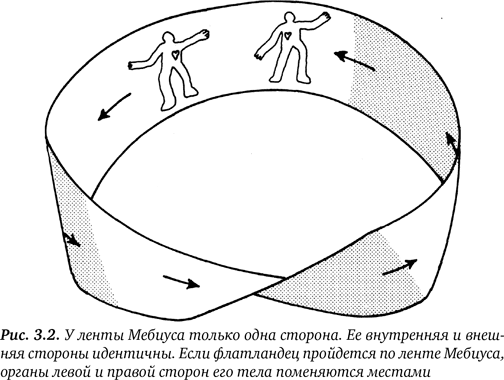 Уэллс прекрасно знал, что существуют два способа представить себе, каким образом «левые» предметы можно преобразить в «правые». К примеру, флатландца можно приподнять над его миром, повернуть и снова поместить во Флатландию, таким образом изменив положение его органов. Флатландцы могут также жить на ленте Мёбиуса — полосе бумаги, один конец которой повёрнут на 180?, а затем концы склеены вместе. Если флатландец пройдёт по ленте Мёбиуса и вернётся на прежнее место, то обнаружит, что его левосторонние и правосторонние органы поменялись местами (рис. 3.2). Ленты Мёбиуса обладают и другими удивительными свойствами, привлекавшими учёных в прошлом веке. К примеру, если пройти по поверхности ленты и вернуться в исходную точку, то окажется, что у ленты лишь одна сторона. Кроме того, если разрезать ленту пополам по осевой линии, она останется целой. Это явление породило математический лимерик: