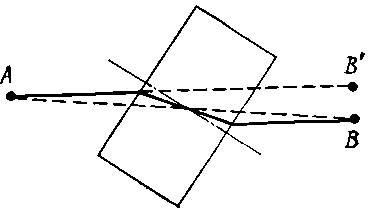 Другой интересный пример! На пути света под некоторым углом поставлена четырехгранная стеклянная призма с параллельными гранями. Свет проходит из точки А в В и, встретив на своем пути призму (фиг. 26.6), отклоняется, причем длительность пути в призме уменьшается за счет изменения наклона траектории, а путь в воздухе немного удлиняется.
