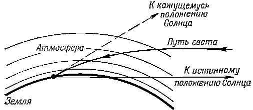 Дело здесь в следующем. Земная атмосфера вверху разрежена, а в нижних слоях более плотная. Свет распространяется в воздухе медленнее, чем в вакууме, и поэтому солнечные лучи достигнут какой-то точки за горизонтом быстрее, если будут двигаться не по прямой линии, а по траектории с более крутым наклоном в плотных слоях атмосферы, сокращая таким образом свой путь в этих слоях.