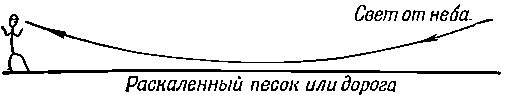 Еще пример того же рода — мираж, который часто наблюдают путешественники на раскаленных солнцем дорогах. Они видят на дороге «воду», а когда подъезжают туда, то кругом оказывается все сухо, как в пустыне! Сущность явления в следующем. То, что мы видим в этом случае, это «отраженный» дорогой свет. На фиг. 26.8 показано, как падающий на дорогу луч света попадает к нам в глаз. Почему?