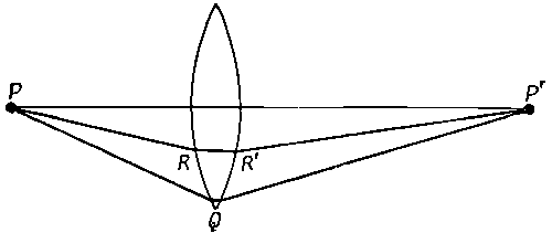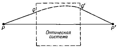 И еще один пример. Представим себе такую ситуацию, когда весь свет, испускаемый в точке Р, собирается обратно в другую точку Р' (фиг. 26.9).