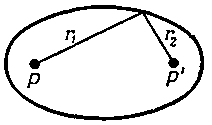 На любом пути свет должен отразиться от зеркала, и время для всех путей должно быть одинаковым. В данном случае свет проходит только в воздухе, так что время прохождения пропорционально длине пути. Поэтому требование равенства времен сводится к требованию равенства полных длин путей. Следовательно, сумма расстояний r1 и r2 должна оставаться постоянной. Эллипс обладает как раз тем свойством, что сумма расстояний любой точки на его кривой от двух заданных точек постоянна; поэтому свет, отразившись от зеркала, имеющего такую форму, наверняка попадет из одного фокуса в другой.