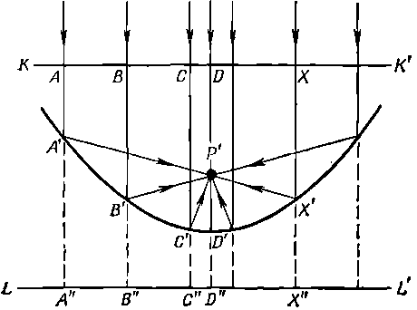 Далее лучи должны отразиться от зеркала и за равные промежутки времени попасть в фокус Р'. Это означает, что мы должны найти такую кривую, для которой сумма расстояний ХХ'--Х'Р' будет постоянна, независимо от выбора точки X. Легче всего это сделать, продолжив отрезок XX' до плоскости LL'. Потребуем теперь, чтобы выполнялись соотношения А'А"=А'Р',В'В"=В'Р', С'С"=С'Р' и т. д.; в этом случае мы получаем нужную нам кривую, потому что сумма длин А 'А+А 'Р'=АА'+А 'А'' будет постоянной для всех точек кривой. Значит, наша кривая есть геометрическое место всех точек, равноудаленных от линии и некоторой заданной точки. Такая кривая называется параболой; вот зеркало телескопа и было изготовлено именно в форме параболы.