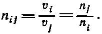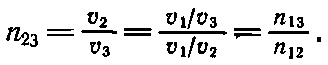 Другими словами, мы предсказываем, что показатель преломления для перехода из одного материала в другой можно получить из показателей преломления каждого материала по отношению к некоторой среде, скажем воздуху или вакууму. Таким образом, измерив скорость света во всех средах, мы образуем одно число для каждой среды — показатель преломления для перехода из вакуума в среду — и называем его ni (например, ni для воздуха есть отношение скорости в воздухе к скорости в вакууме и т. д.), после чего легко написать нужную формулу. Показатель преломления для любых двух материалов i и j равен