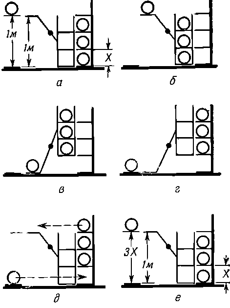 Фиг. 4.2. Обратимая машина. а — начальное положение; б — загрузка шаров; в — . 1 кг поднимает 3 кг на высоту X; г — разгрузка шаров; д — восстановление; е — конечное положение.