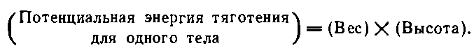 Четвертый лежит на подставке в одном метре от пола. Машина может поднять три шара, опустив один шар на 1 м. Устроим подвижную платформу с тремя полками высотой X, и пусть высота полок стеллажа тоже будет X (фиг. 4.2,а). Перекатим сперва шары со стеллажа на полки платформы (фиг. 4.2,б); предположим, что для этого энергии не понадобится, потому что полки и стеллаж находятся на одной высоте. Затем включим обратимую машину: она скатит одиночный шар на пол и подымет платформу на высоту X (фиг. 4.2,в). Но мы сконструировали платформу столь остроумно, что шары опять оказались в точности на уровне полок стеллажа. Разгрузим же шары с платформы на стеллаж (фиг. 4.2,г). После разгрузки машина вернется в первоначальное положение. Теперь уже три шара лежат на трех верхних полках стеллажа, а четвертый шар — на полу. Но смотрите, какая странная вещь: по существу два шара мы не поднимали вовсе, ведь на полках 2 и 3 шары как лежали вначале, так лежат и теперь. В итоге поднялся только один шар, но зато на высоту 3Х. Если бы высота ЗХ оказалась больше 1 м, то можно было бы опустить шар, чтобы вернуть машину к начальным условиям (фиг. 4.2,е) и начать работу сначала. Значит, высота 3Х не может быть больше 1 м, ибо начнется вечное движение. Точно так же можно доказать, что 1 м не может быть больше 3Х: машина обратима, пустим ее назад и докажем. Итак, 3Х ни больше, ни меньше 1 м. Мы открыли при помощи одних только рассуждений закон: Х=1/3 м. Обобщить его легко; 1 кг падает при работе обратимой машины с некоторой высоты; тогда машина способна поднять р кг на 1/р высоты. Если, другими словами, 3 кг умножить на высоту их подъема (X), то это равно 1 кг, умноженному на высоту его падения (1 м). Помножив все грузы в машине на высоту, на которой они лежат, дайте машине поработать и опять помножьте все веса на их высоты подъема; в итоге должно выйти то же самое. (Мы перешли от случая, когда двигался только один груз, к случаю, когда за счет опускания одного груза поднимается несколько грузов. Но это, надеюсь, понятно?) Назовем сумму весов, умноженных на высоту, потенциальной энергией тяготения, т. е. энергией, которой обладает тело вследствие своего положения в пространстве по отношению к земле. Формула для энергии тяготения, пока тело не слишком далеко от земли (вес при подъеме ослабляется), такова: