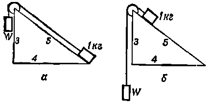 Принцип сохранения энергии во многих обстоятельствах оказывается очень полезен при предсказании того, что может произойти. В средней школе мы учили немало правил о блоках и рычагах. Мы можем теперь убедиться, что все эти «законы» сводятся к одному, и нет нужды запоминать 75 правил. Вот вам простой пример: наклонная плоскость. Пусть это треугольник со сторонами 3, 4, 5 (фиг. 4.3).