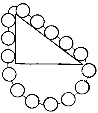 Мы хотим знать, какова должна быть тяжесть W, чтобы уравновесить груз 1 кг. Рассуждаем так. Если грузы W и 1 кг уравновешены, то это — обратимое состояние, и веревку можно двигать вверх-вниз. Пусть же вначале (фиг. 4.3,а) 1 кг находится внизу плоскости, а груз W — наверху. Когда W соскользнет вниз, груз 1 кг окажется наверху, а W опустится на длину склона (фиг. 4.3,6), т. е. на 5 м. Но ведь мы подняли 1 кг только на высоту 3 м, хотя опустили W на 5 м. Значит, W=3/5 кг. Заметьте, что этот ловкий вывод получен не из разложения сил, а из сохранения энергии. Ловкость, впрочем, относительна. Существует другой вывод, куда красивее. Он придуман Стевином и даже высечен на его надгробии. Фиг. 4.4 объясняет, почему должно получиться 3/5 кг: цепь не вращается и нижняя ее часть уравновешена сама собой, значит сила тяги пяти звеньев с одной стороны должна уравнять силу тяги трех звеньев с другой (по длине сторон).