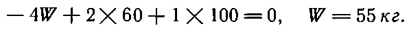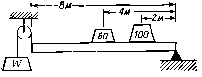 Подопрем один конец стержня (или рейки) длиной 8 м. Посредине рейки поместим груз весом 60 кг, а в 2 м от подпорки — груз весом 100 кг. Сколько надо силы, чтобы удержать рейку за другой конец в равновесии, пренебрегая ее весом? Пусть мы прикрепили блок и перекинули через него веревку, привязав ее к концу рейки. Каков же должен быть вес W, уравновешивающий стержень? Представим, что вес опустился на произвольное расстояние (для простоты пусть это будет 4 см); на сколько тогда поднимутся наши два груза? Середина рейки на 2 см, а второй груз (он лежит на четверти длины рейки) на 1 см. Значит, в согласии с правилом, что сумма весов, умноженных на высоты, не меняется, мы должны написать: вес W на 4 см вниз плюс 60 кг на 2 см вверх плюс 100 кг на 1 см вверх, что после сложения должно дать нуль: