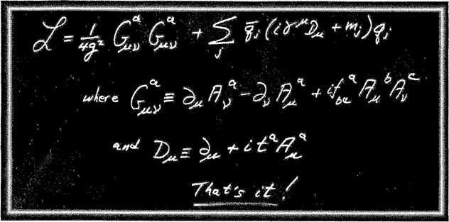 Уравнения, приведенные на рис. 7.3, очень сильно отличаются от шуточной унификации Фейнмана. Как и в U = 0, в управляющих уравнениях КХД зашифровано множество отдельных более мелких уравнений. (Для экспертов: управляющие уравнения содержат матрицы тензоров и спиноров, более мелких уравнений, компоненты которых включают обычные числа.) Тем не менее существует большая разница. Когда мы раскладываем уравнение U = 0, мы получаем множество не связанных друг с другом вещей. Когда мы раскладываем управляющие уравнения КХД, мы получаем уравнения, которые связаны симметрией — цветов, различных направлений в пространстве, а также симметрией специальной теории относительности между системами, движущимися с постоянной скоростью. Все их содержимое непосредственно доступно, а распаковывающие их алгоритмы вытекают из однозначной математики симметрии. Итак, позвольте мне заверить вас в том, что вы сейчас действительно удивитесь! Это по-настоящему элегантная теория.