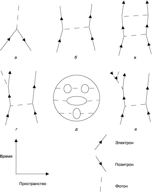 Рис. 7.4. Суть КЭД: а — суть квантовой электродинамики состоит в следующем: фотоны реагируют на электрический заряд; б — хорошее приближение к силе взаимодействия между электронами в результате обмена виртуальными фотонами; в — более точное приближение подразумевает такие вклады; г — да будет свет! Ускоренный электрон может испустить фотон; д — полностью виртуальный процесс; е — излучение пары «электрон — позитрон». Антиэлектрон, или позитрон, представлен в виде электрона, движущегося назад во времени