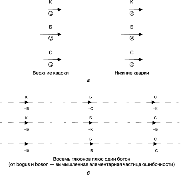 Три вида заряда в КХД без особой на то причины называются «цветами». Эти «цвета», разумеется, не имеют ничего общего с цветом в обычном смысле этого слова; скорее, они очень похожи на электрический заряд. В любом случае мы будем называть их красным, зеленым и синим. Каждый кварк имеет одну единицу того или иного цветного заряда. Кроме того, кварки бывают разных сортов или «ароматов». Два аромата, которые играют определенную роль в обычной материи, называются u и d, верхний и нижний[19]. Кварковые «ароматы» также не имеют ничего общего с запахом, как кварковые «цвета» не имеют ничего общего с цветом. Кроме того, эти метафорические названия для кварков u и d (дзенский коан: каков вверх на вкус?) не означают, что между ароматами и направлениями в пространстве существует какая-то реальная связь. Не вините меня; когда я получаю возможность назвать частицу, я употребляю по-научному звучащие слова, например «аксион» и «энион».