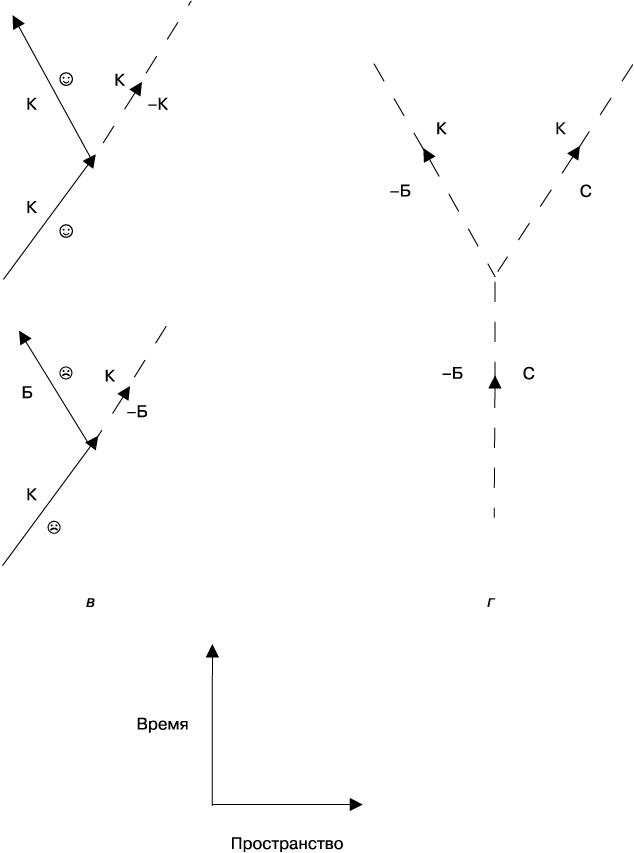 Суть КЭД можно выразить с помощью единственного изображения, приведенного на рис. 7.4, а. На нем показано, что фотон реагирует на присутствие или движение электрического заряда. Эта маленькая картинка, хоть и кажется мультяшной, представляет собой гораздо больше, чем метафору. Это базовый процесс системного метода решения уравнений квантовой электродинамики, которым мы обязаны Фейнману. (Да, опять он. Прости, Мюррей.) Диаграммы Фейнмана изображают процессы в пространстве и времени, в результате которых частицы находившиеся в некотором месте в одно время, перемещаются в другое место в некоторое другое время. Между этими моментами они могут влиять друг на друга.