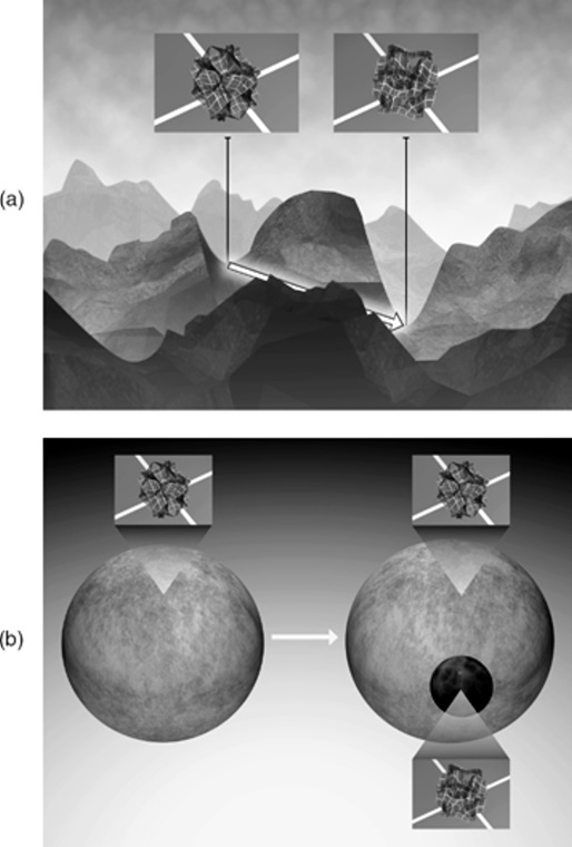 Рис. 6.6. а) Квантовое туннелирование в струнном ландшафте; б) Туннелирование порождает небольшую область пространства, внутри которой произошло изменение формы дополнительных измерений (небольшой тёмный пузырёк)