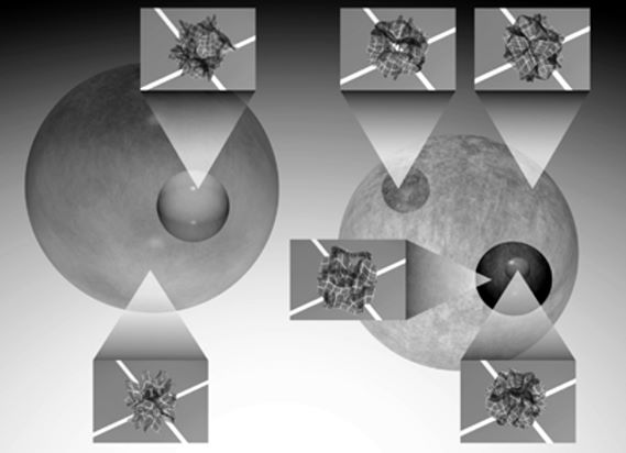 Процесс может повториться. Дальнейшее туннелирование в других местах внутри не только исходной вселенной, но и внутри новой вселенной, приведёт к появлению дополнительных расширяющихся пузырьков, что в свою очередь породит области с совсем другими формами дополнительных измерений (рис. 6.7). И так всё пространство будет заполнено пузырьками внутри пузырьков, расположенных, в свою очередь, внутри других пузырьков — в каждом будет происходит инфляционное расширение, каждому будет присуща своя форма дополнительных измерений и в каждом значение космологической постоянной будет меньше, чем у большего пузырька, внутри которого он образовался.