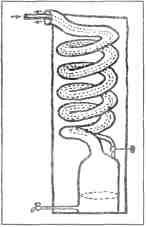 Рис. 10. Машина для превращения воздуха в жидкость. Сжатый воздух втекает в машину по внутренней трубке, обозначенной на рисунке штрихом. Попав в камеру, воздух расширяется, делается холоднее и возвращается по наружной трубе. Поднимаясь по наружной трубе, он охлаждает новую порцию сжатого воздуха, которая в это время опускается в камеру по внутренней трубке. В конце концов воздух превращается в жидкость и каплями стекает в камеру. Открыв кран, можно выпустить из машины жидкий воздух, как кипяток из самовара