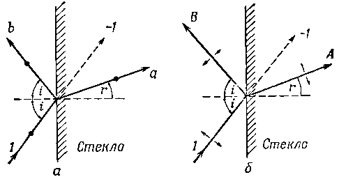 На фиг. 33.6,б показана подобная же ситуация, но в предположении, что падающий луч поляризован в плоскости рисунка. Здесь через В и А обозначены соответственно амплитуды отраженной и преломленной волн.