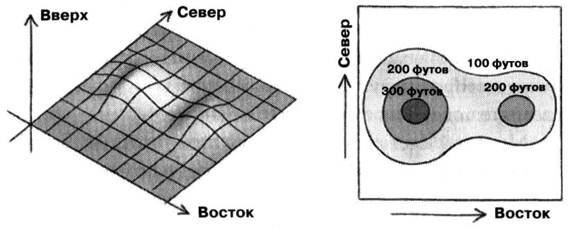 Чтобы лучше понять, что я имею в виду под маркировкой мирового листа ярлычками, представьте себе топографическую карту. На ней проведены горизонтали, или линии равных высот. Каждая из этих линий помечена ярлыком, обозначающим высоту. Если линии идут слишком часто, то метки ставятся только у некоторых из них, например у каждой пятой. Топографическая карта является плоским листом, но она отображает трёхмерный рельеф местности.