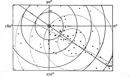 Система шаровых скоплений в проекции на плоскость галактики. Галактическая долгота отмечена через каждые тридцать градусов. «Локальная система» целиком лежит в пределах самого маленького кружка, обведенного сплошной линией, имеющего радиус в тысячу парсеков. Более крупные кружки, обведенные сплошной линией, также гелиоцентричны, но их радиусы возрастают с интервалом по 10 000 парсеков. Пунктиром отмечена предполагаемая большая ось системы, пунктирные круги концентричны относительно ее центра. Точки примерно в четыре раза больше настоящих диаметров скоплений в таком масштабе. Девять скоплений отстоят от плоскости галактики более чем на 15 000 парсеков и не включены в эту схему.