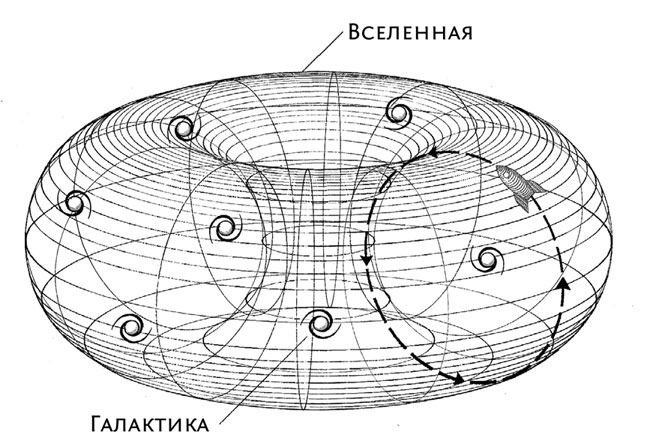 Мы еще вернемся к практическим различиям между великанской и бесконечной вселенной, но лично меня гораздо больше утешает вариант номер два: возможно, вселенная замкнута сама на себя. Это как Пак-Ман, который исчезает на одном краю экрана и тут же появляется с противоположной стороны. С точки зрения Пак-Мана, он идет все вперед и вперед и не может дойти до конца.