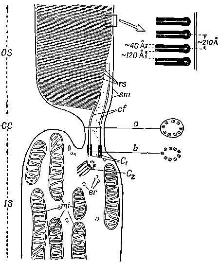 Справа в увеличенном виде слой за слоем видны плоские структуры, содержащие родопсин (зрительный пурпур) — красящее вещество, или пигмент, который, собственно, и обусловливает функцию палочек. Родопсин представляет собой большие молекулы белка, содержащего специальную группу, называемую ретиненом, которая может быть отщеплена от белка, что, несомненно, и является главной причиной поглощения света. Нам пока не понятно, почему эти структуры плоские, но весьма возможно, что это сделано для того, чтобы молекулы родопсина лежали параллельно друг другу. Химия этого явления известна сейчас довольно хорошо, но, кроме того, возможно, что здесь принимает участие и физика. Может оказаться, что все молекулы располагаются в своего рода ряд, и когда одна из них возбуждается, то вылетевший при этом электрон (или просто волна возбуждения) доходит до некоторого места в конце структуры и порождает сигнал или что-нибудь аналогичное. Это очень важная область, и она еще совсем не разработана. Это поле деятельности для биохимии и физики твердого тела или чего-то в этом духе.