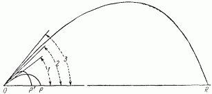 Рис. 29. Как изменяется дальность полета снаряда с изменением угла наклона сверхдальнобойного орудия; при угле 1 снаряд падает в Р', при угле 2 — в Р'', при угле же 3 дальность стрельбы сразу возрастает во много раз, так как снаряд залетает в слои разреженной атмосферы.