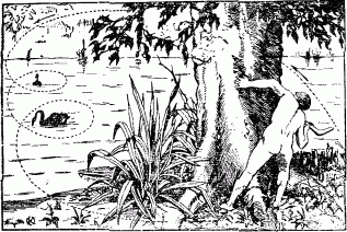 Рис. 34. Как австралийцы пользуются бумерангом на охоте, чтобы поражать жертву из-за прикрытия. Путь полета бумеранга (в случае промаха) показан пунктирной линией.